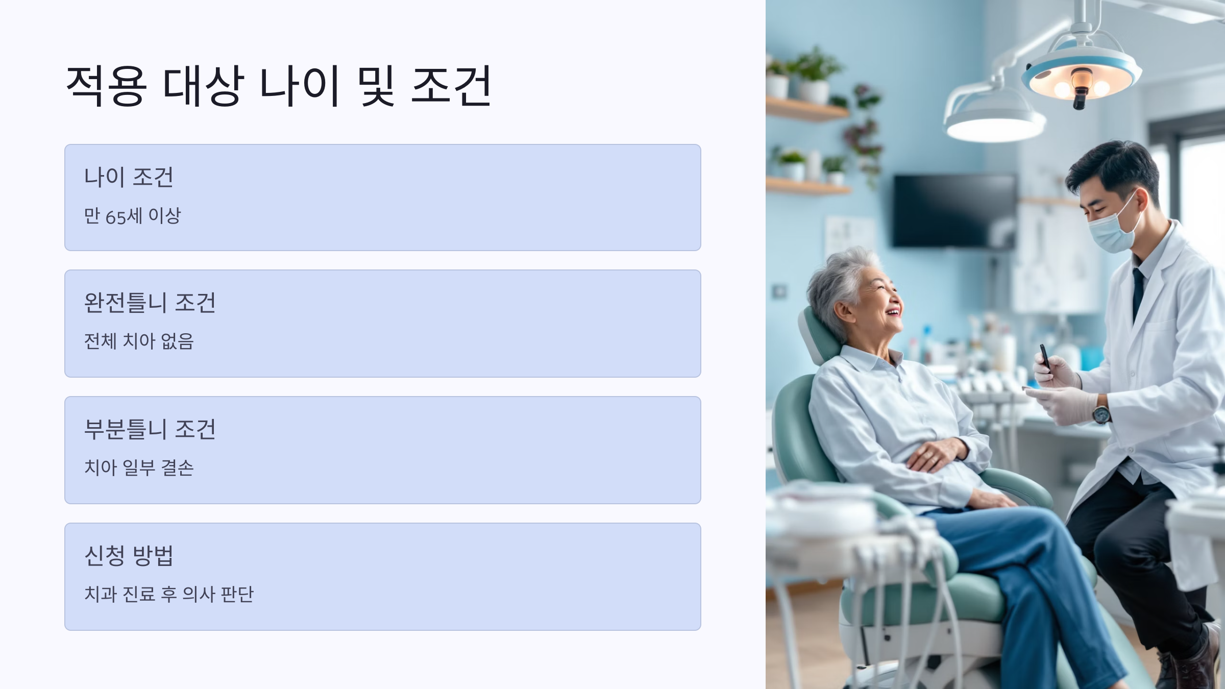 2025년 기준, 노인 틀니 보험급여를 받으려면 다음과 같은 조건을 충족해야 해요.