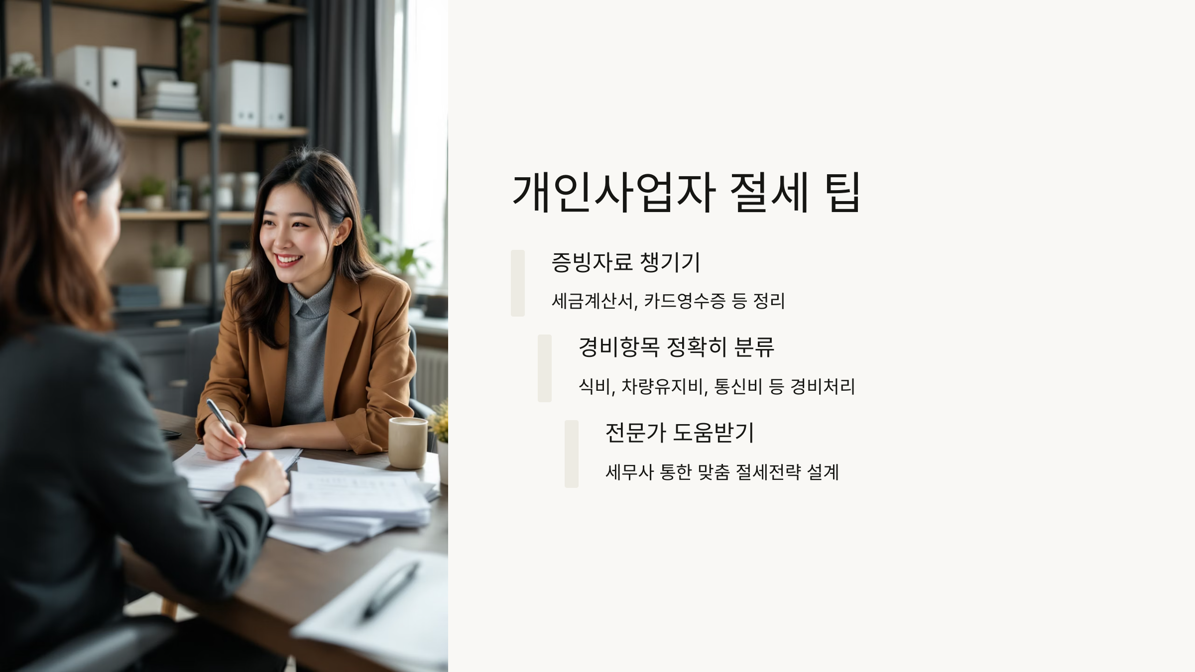 두 번째는 경비 항목을 사업 목적에 맞게 정확히 분류하는 거예요. 식비, 차량 유지비, 통신비 등은 합리적인 선에서 경비처리가 가능하니 놓치지 마세요.
