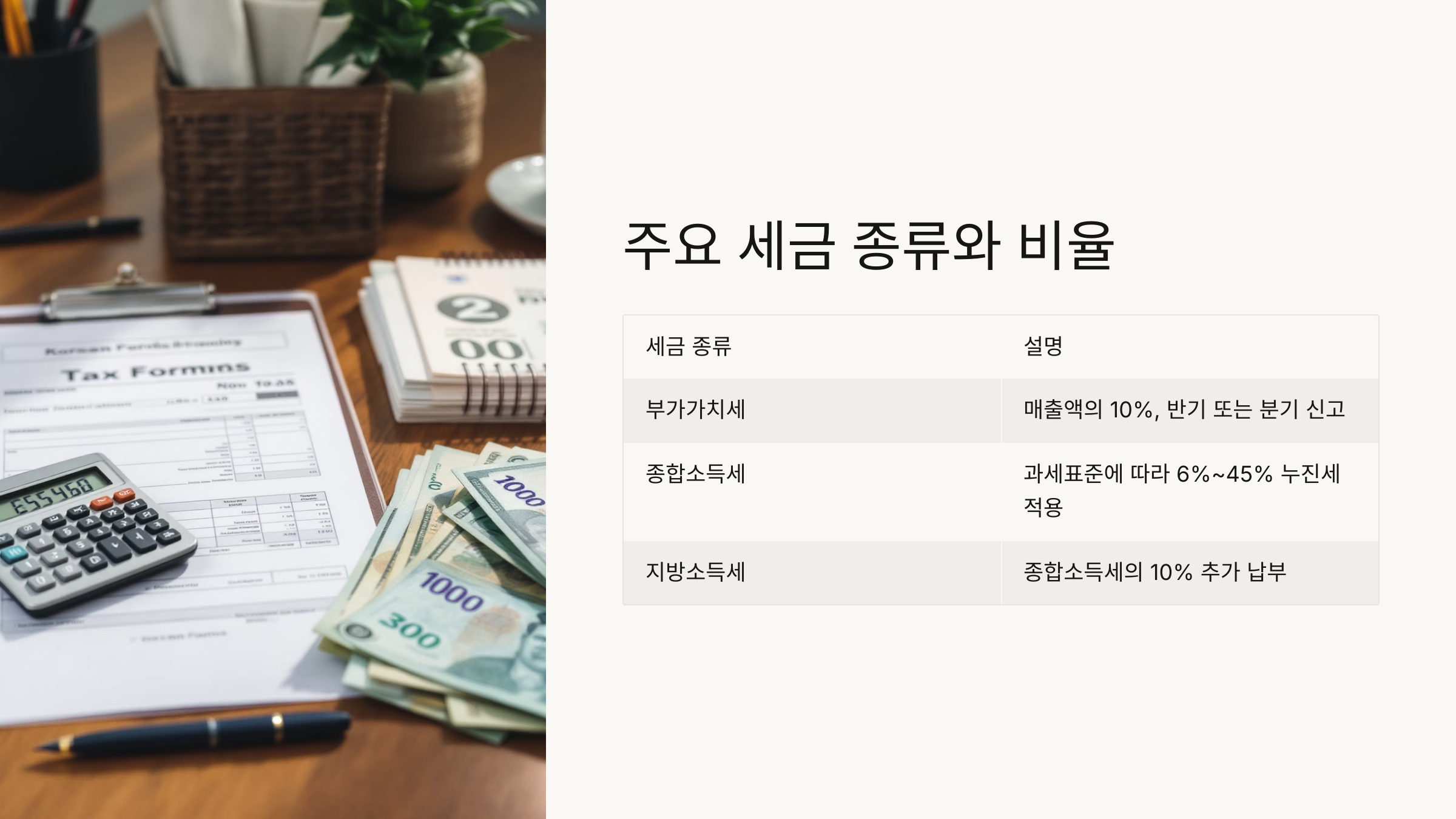 보통은 부가가치세와 종합소득세 두 가지가 핵심인데, 이 외에도 지방소득세나 4대 보험 등 추가적으로 들어가는 비용이 있어요. 사업 규모가 커질수록 개인사업자 세금 비율도 함께 늘어나는 구조죠.
