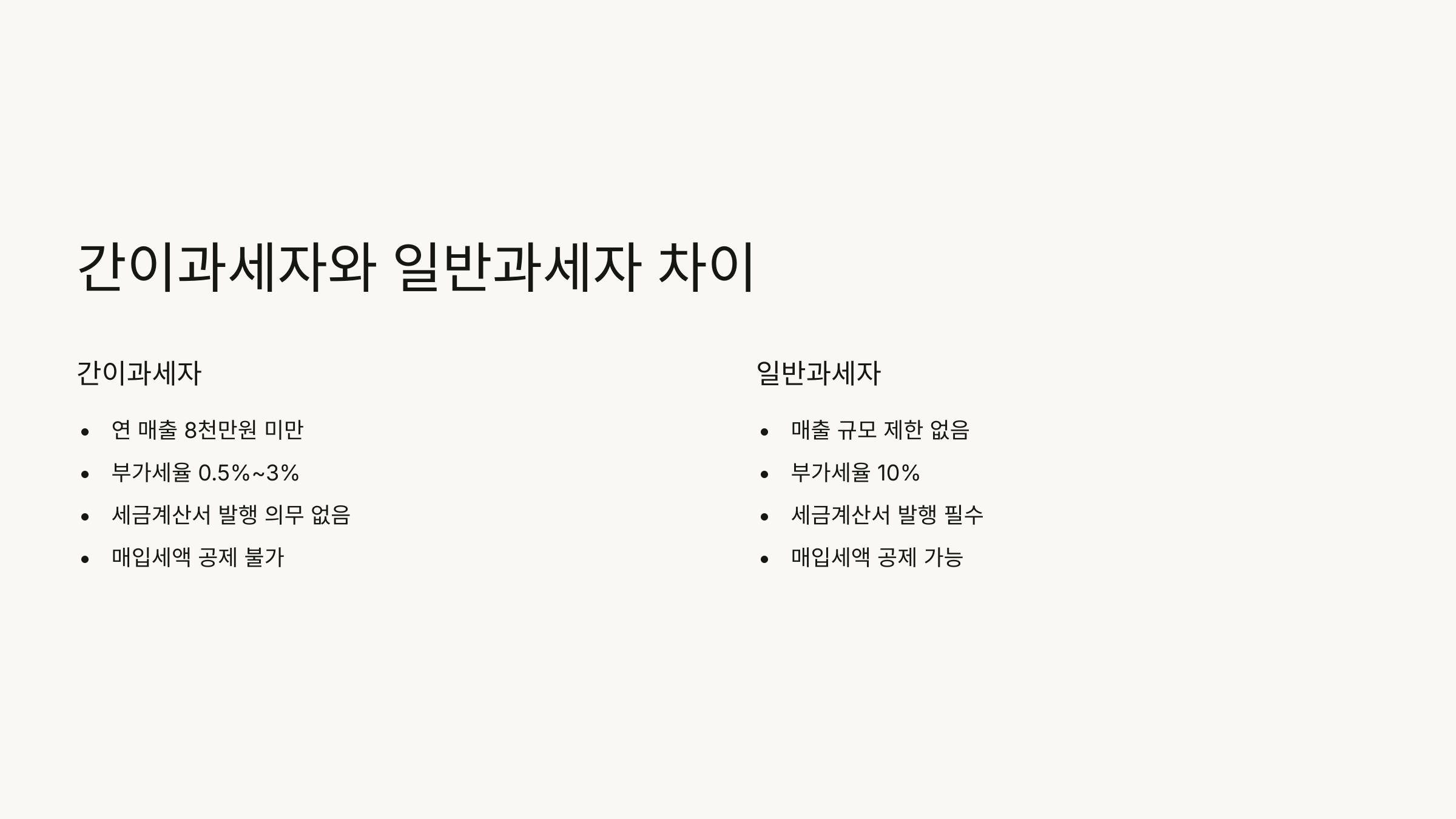 간이과세자는 연 매출 8천만 원 미만인 사업자에게 적용돼요. 이 경우 부가세율 자체가 낮고, 세금 계산서 발행도 의무가 아니에요. 세금 부담이 적은 대신, 매입세액 공제가 안 되는 점이 단점이에요.