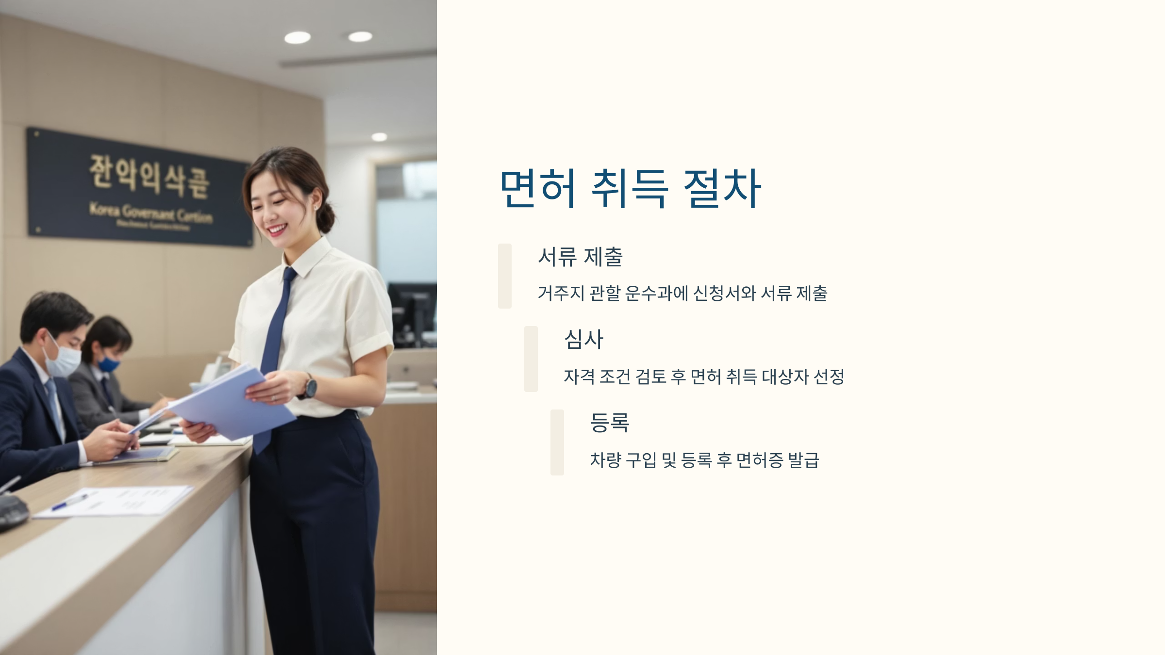 2단계는 심사예요. 제출된 서류를 기반으로 자격 조건을 검토하고, 문제가 없다면 면허 취득 대상자로 선정돼요.