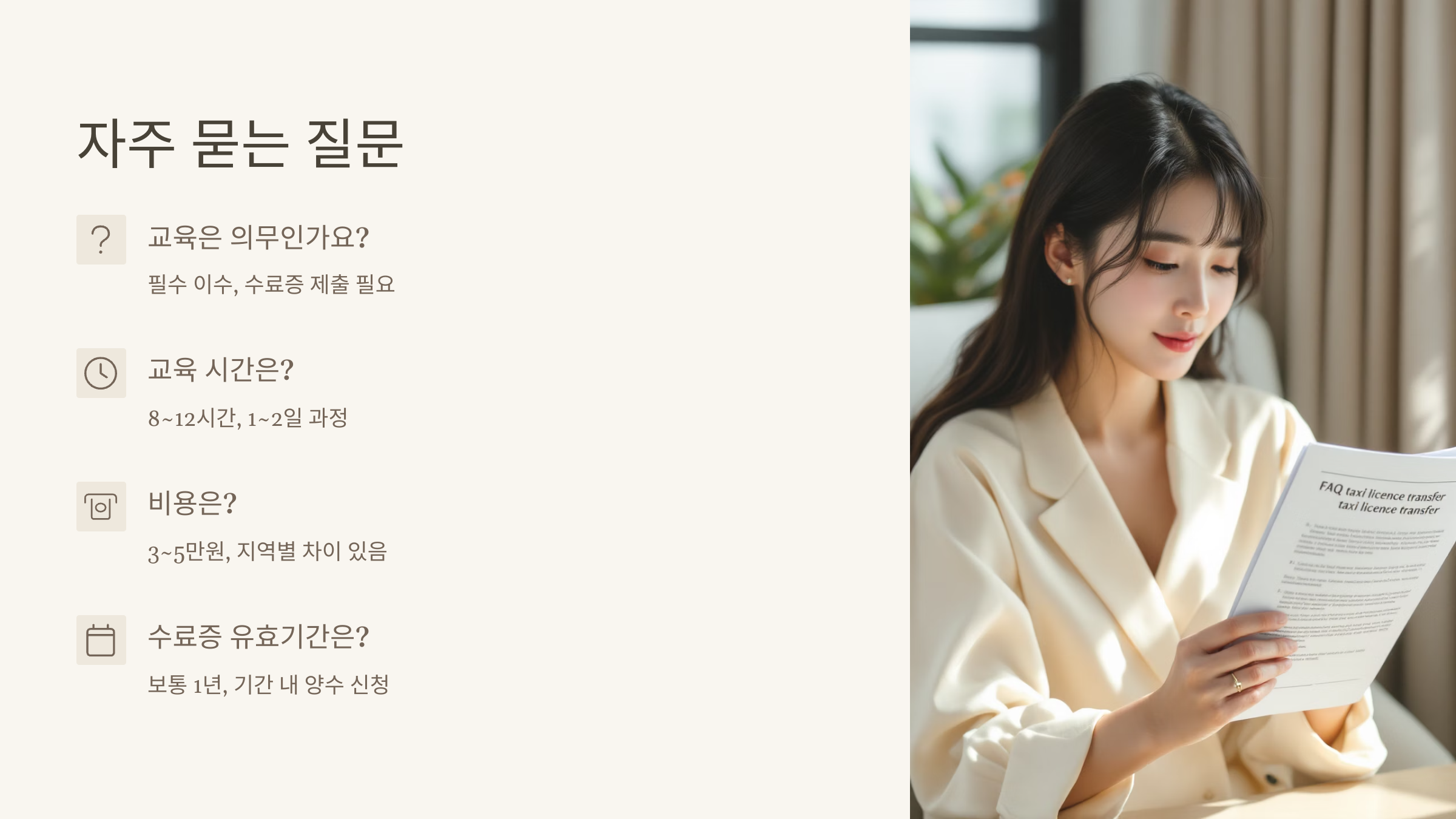 양수자 입장에서는 안정적인 수익과 자유로운 근무가 가능하다는 장점이 있어요. 하지만 규제가 까다로운 만큼 절차를 잘 숙지하고, 무엇보다 필수인 ‘개인택시 양수 교육’을 성실히 이수해야 모든 과정이 원활하게 흘러가요.