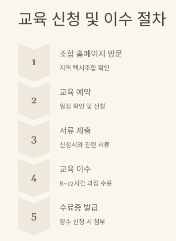 ① 해당 지역 택시조합 홈페이지 방문 ② 교육 일정 확인 및 예약 신청 ③ 신청서 및 관련 서류 제출 ④ 교육 이수 및 수료증 발급 ⑤ 양수 신청 시 수료증 첨부