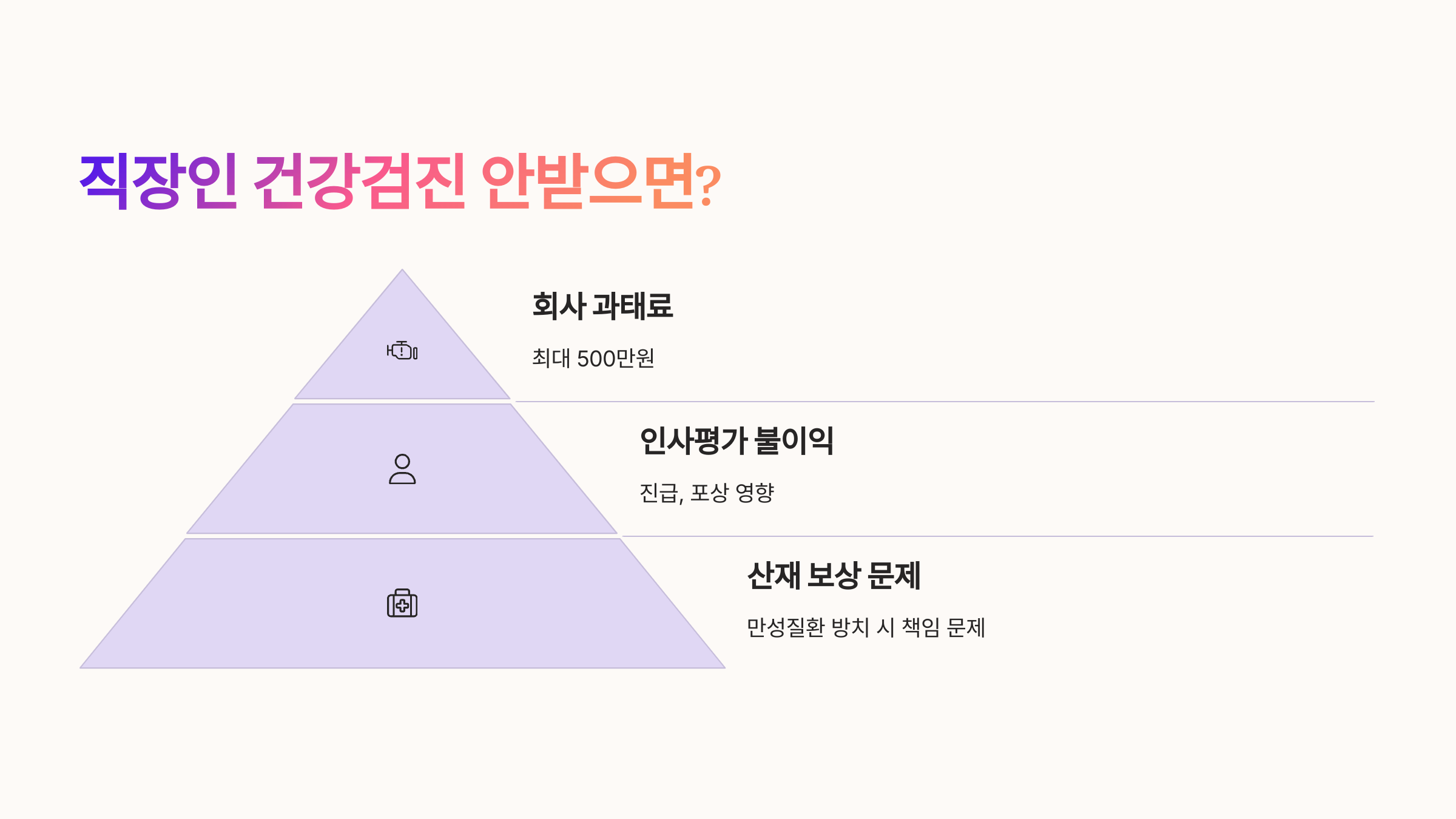 또한, 검진을 받지 않으면 '산재' 발생 시 보상 과정에서 문제가 생길 수 있어요. 예를 들어, 고혈압, 당뇨 등 만성질환을 방치해 사고로 이어졌다면, 사업주와 근로자 모두 책임을 피하기 어려워질 수 있죠.