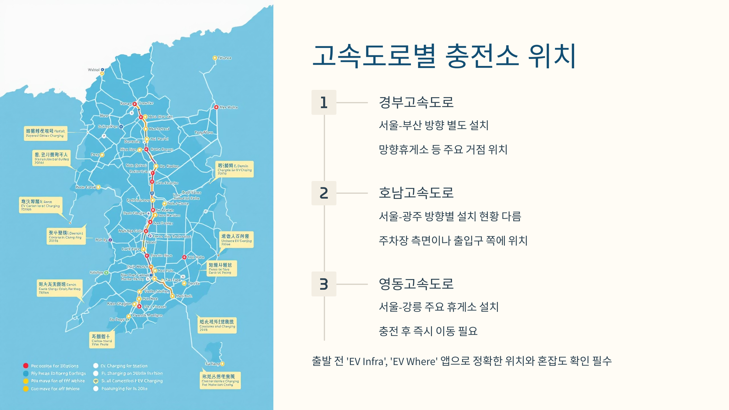 호남고속도로, 영동고속도로, 중부내륙고속도로 등 다른 노선들도 각 방향별로 설치 현황이 다르니 출발 전 ‘EV Infra’, ‘EV Where’ 같은 앱으로 정확한 위치와 혼잡도를 확인하는 게 필요해요.