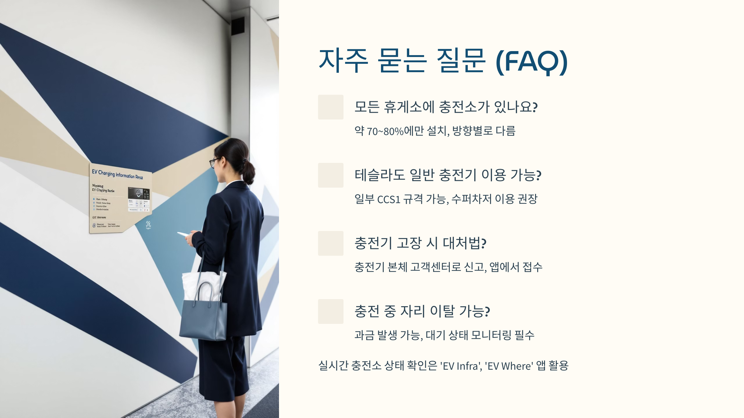 하지만 아직까지 일부 휴게소는 충전기 수가 1~2대에 불과해 출퇴근 시간대나 연휴에는 대기 시간이 발생할 수 있어요. 때문에 실시간 확인 앱 활용이 정말 중요해요.