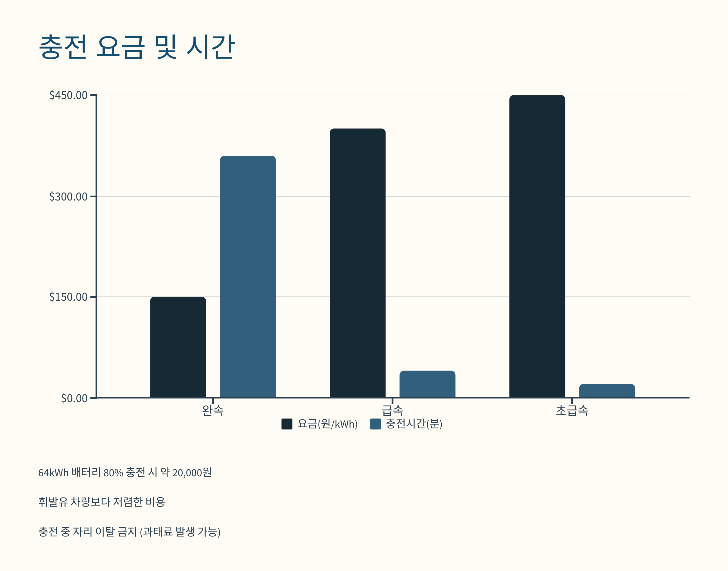 예를 들어 64kWh 배터리를 80%까지 충전한다고 가정하면, 약 50kWh를 충전해야 하므로 20,000원 안팎의 요금이 발생해요. 이는 휘발유 차량보다 훨씬 저렴한 수준이지만, 야간 시간대에는 할인이 적용되지 않는 경우도 있어요.