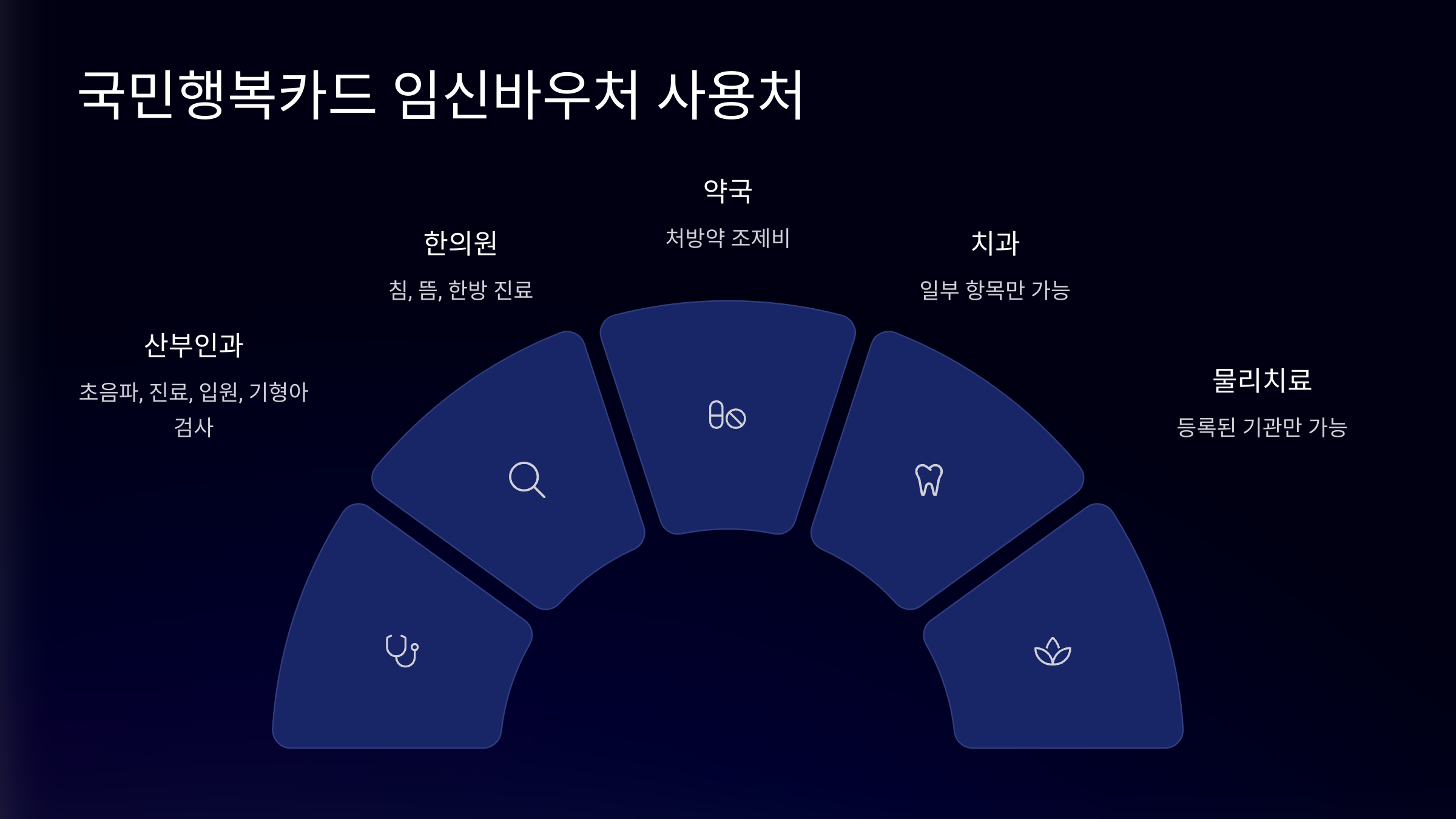 국민행복카드 임신바우처 사용처는 크게 산부인과, 한의원, 약국, 조산원, 치과(일부 항목), 물리치료 기관 등으로 나뉘어요. 사용 가능한 의료기관은 복지로(www.bokjiro.go.kr) 또는 카드사 홈페이지에서 조회할 수 있어요.