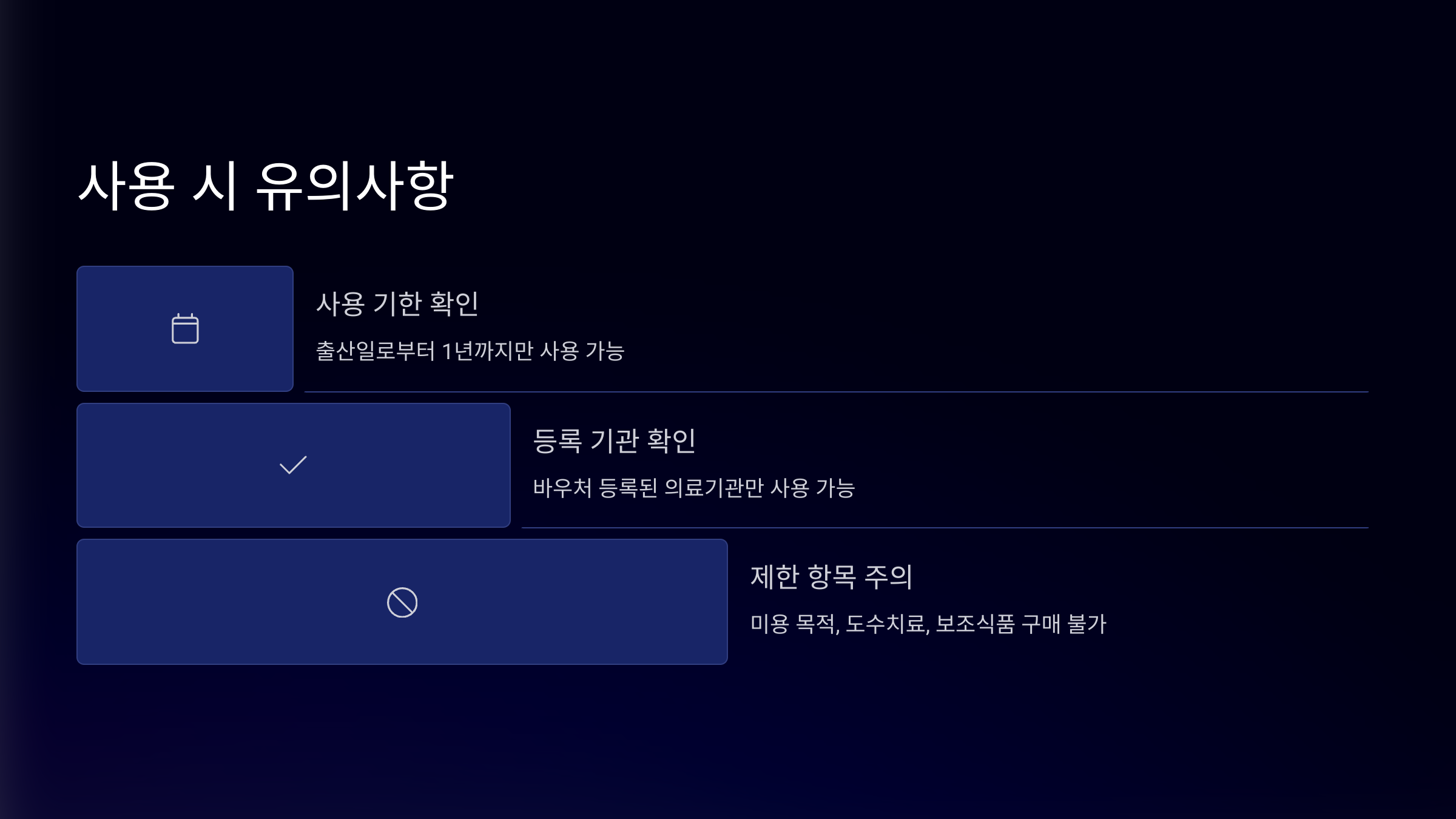 치료 항목 역시 제한이 있어요. 미용 목적 시술, 도수치료, 단순 보조식품 구매 등은 바우처로 결제할 수 없어요. 꼭 진료와 관련된 의학적 서비스에만 사용할 수 있다는 점, 기억해두세요!