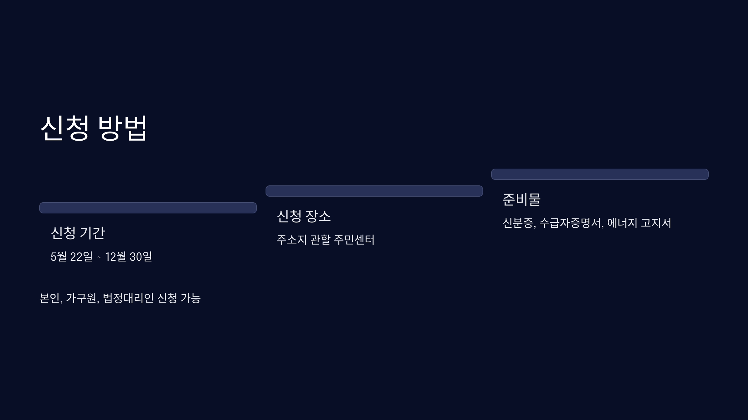 에너지 바우처 신청은 매년 5월부터 12월까지 진행돼요. 2025년에는 5월 22일부터 신청이 시작되었고, 마감은 12월 30일까지예요. 신청 기한 내에만 접수하면 여름과 겨울 바우처를 동시에 받을 수 있기 때문에, 가능한 한 빠르게 신청하는 것이 좋아요.