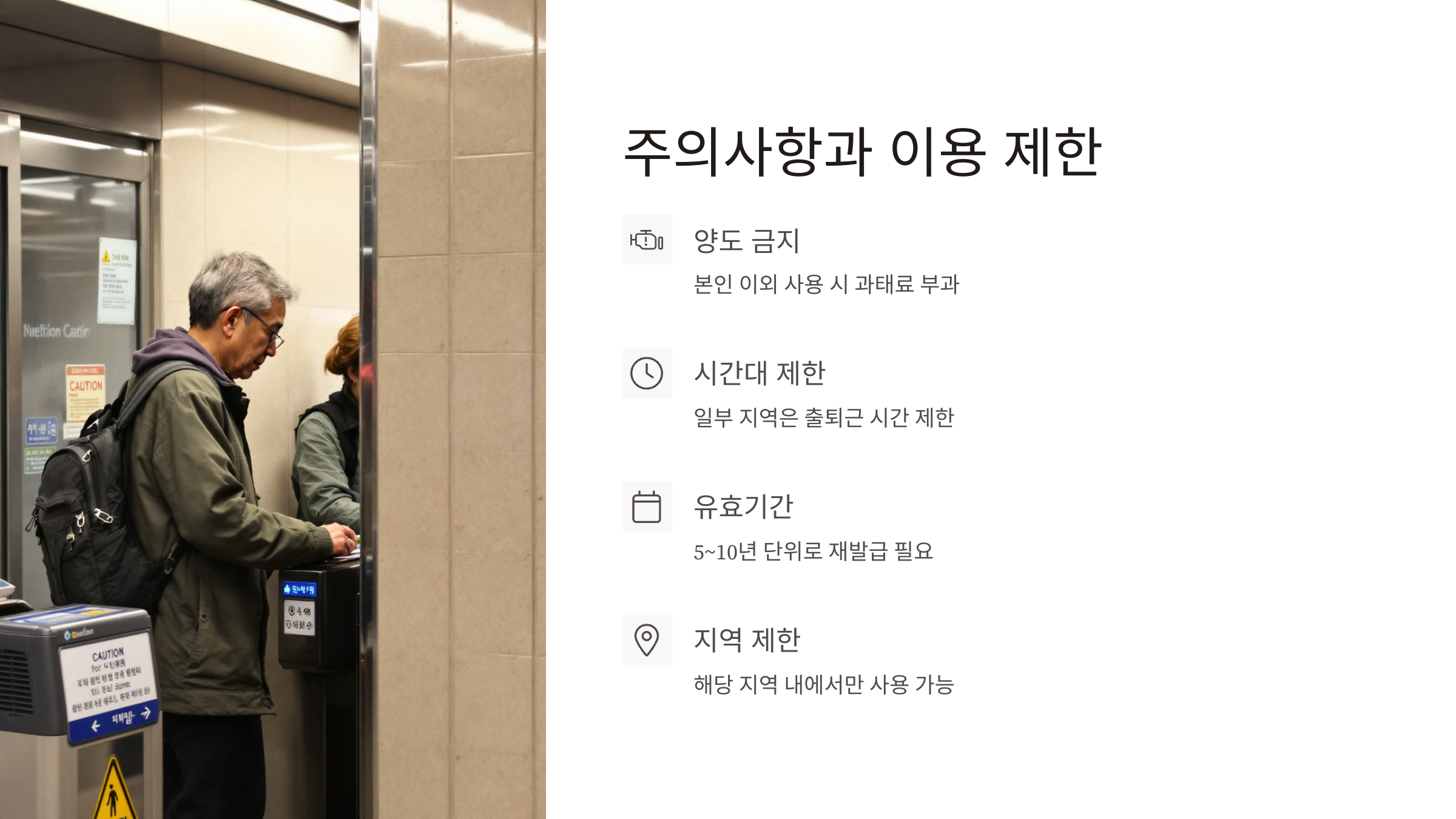 노인 무임교통카드는 아주 유용한 제도이지만, 사용 시 몇 가지 주의사항이 있어요. 우선, 양도 또는 대여는 불법이에요. 본인 이외 사용 시 과태료 부과 또는 카드 회수 조치가 이루어져요.