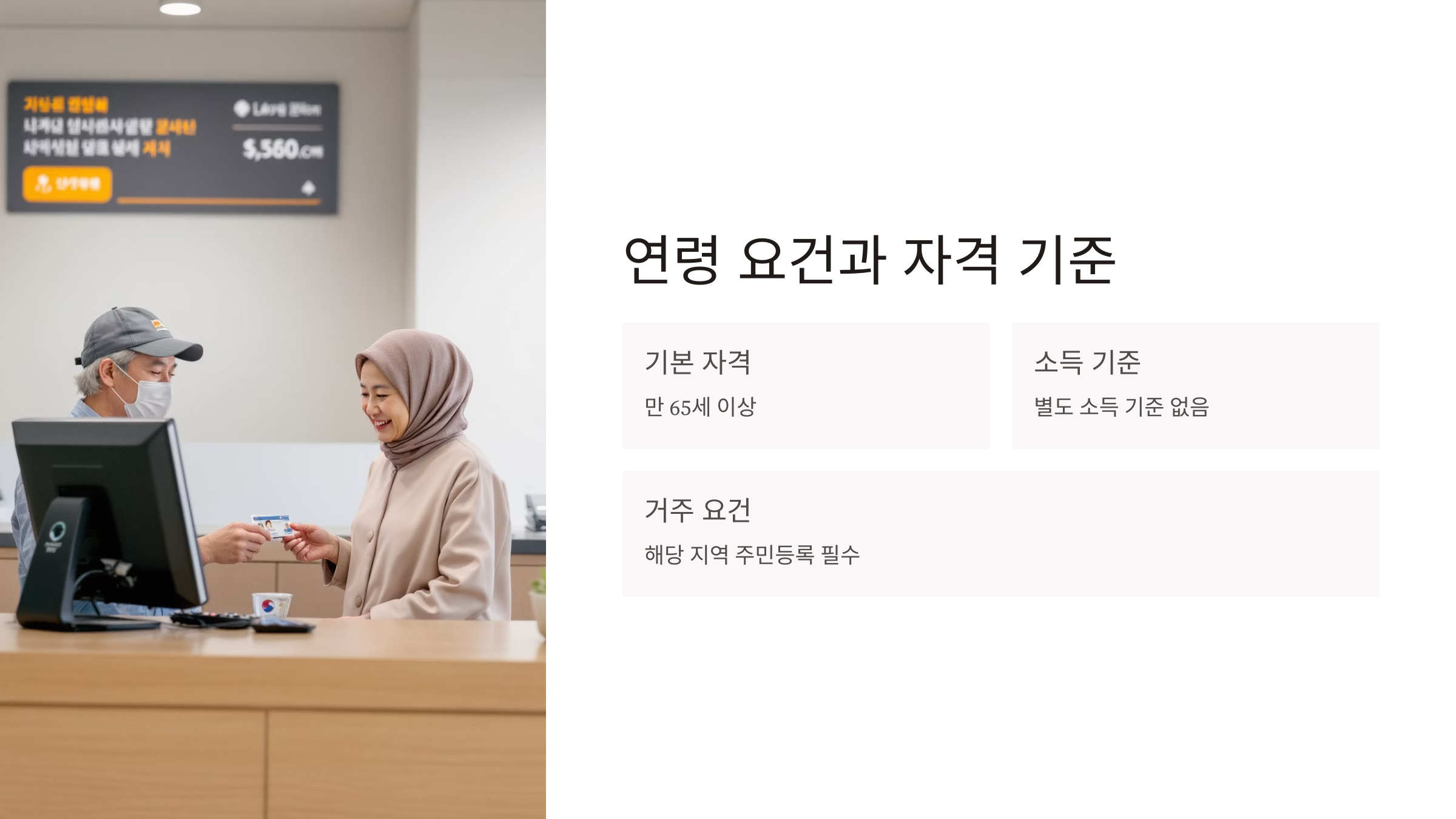 별도의 소득 기준이나 건강상태 기준은 없어요. 즉, 만 65세 이상이면 신청 가능하며, 건강보험료 수준이나 연금 수급 여부와는 무관해요.