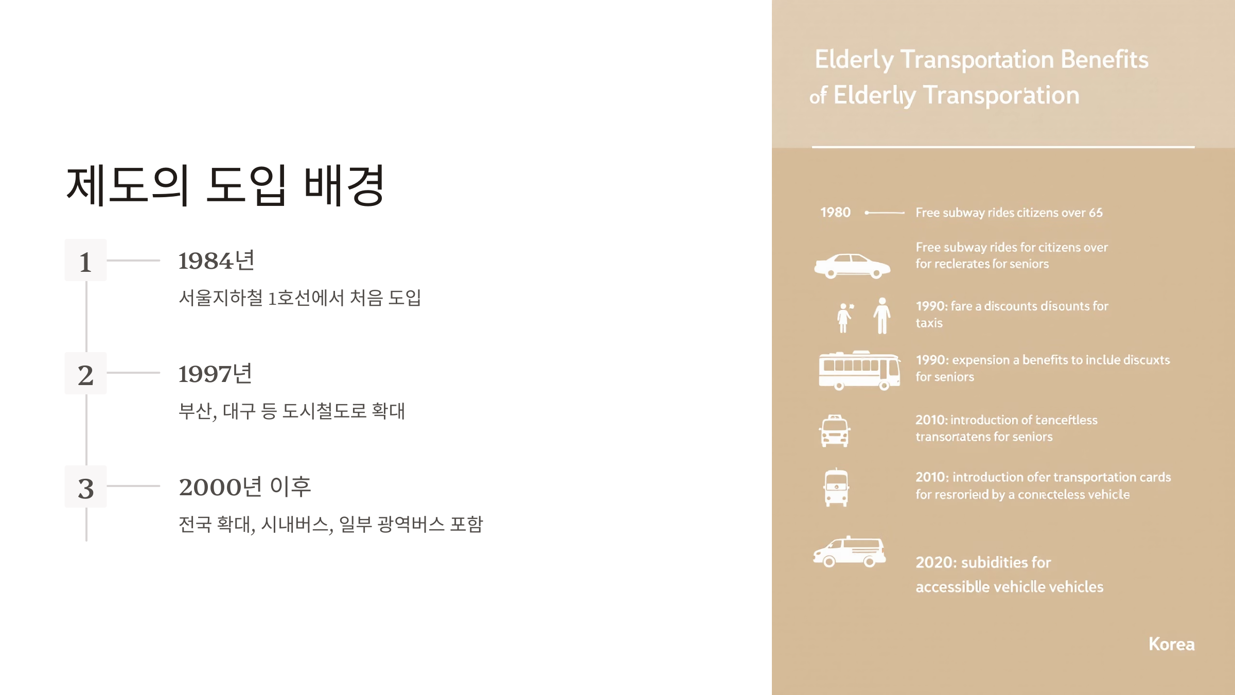 교통은 단순한 이동 수단을 넘어서 노인의 사회 참여, 자립 생활, 병원 이용, 여가 활동을 가능하게 만드는 삶의 기반이에요. 그래서 노인의 교통권 보장은 곧 인간다운 삶의 권리와 맞닿아 있어요.