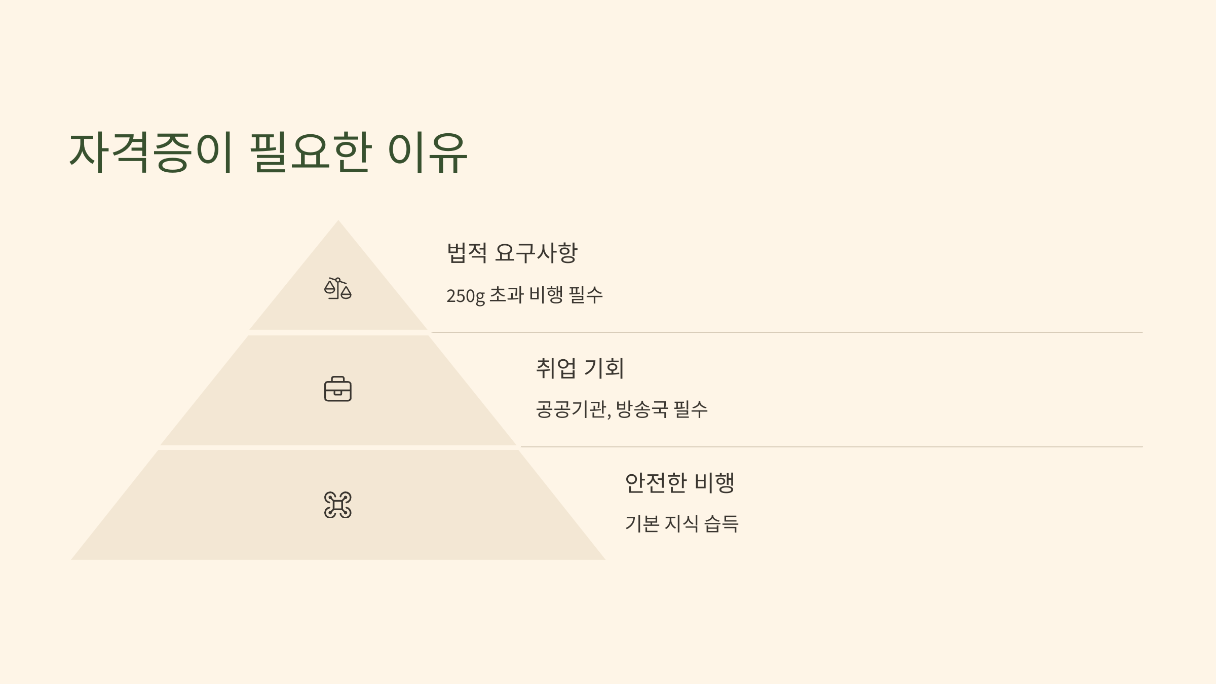 또한 국가공공기관, 방송국, 측량회사, 드론촬영업체 등에서 활동하려면 2종 또는 3종 이상 자격이 요구돼요. 취업·창업을 고려한다면 필수로 갖춰야 하는 역량이에요.