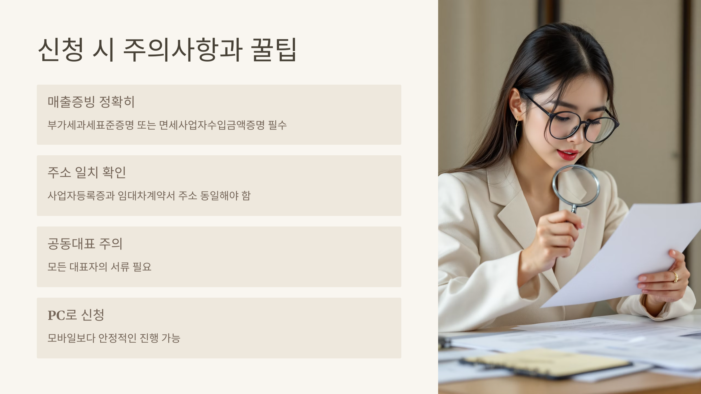 많은 분들이 놓치는 부분이에요. 제출한 임대차계약서상의 주소와 사업자등록증 주소가 다르면 반려될 수 있어요. 정확히 일치하도록 서류를 제출해야 하고, 공유 오피스, 임시 주소는 인정이 어려울 수도 있어요.