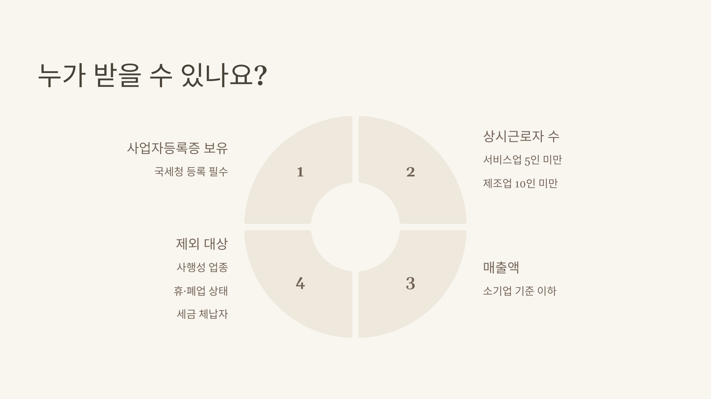 소상공인정책자금 지원대상 확인서를 받을 수 있는 사람은 말 그대로 ‘소상공인’이에요. 하지만 여기서 말하는 소상공인은 단순히 작은 가게 운영자만을 말하는 게 아니고, 정부가 정한 매출 기준과 종업원 수, 업종 분류까지 모두 만족해야 해요.