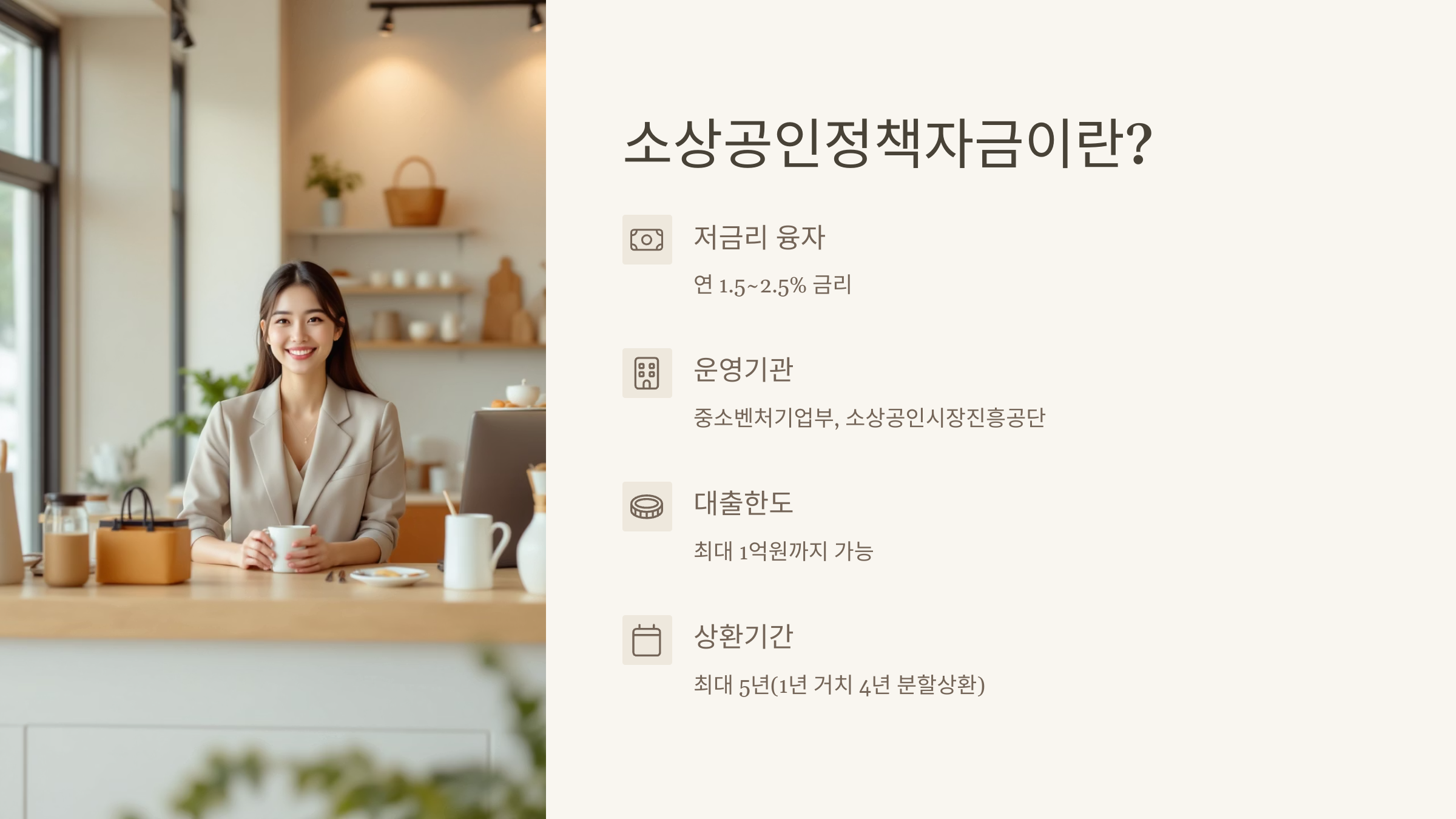 2025년 기준 소상공인정책자금은 금리가 연 1.5%~2.5% 사이로, 시중은행보다 훨씬 낮고 상환 기간도 최대 5년(1년 거치 4년 분할상환)까지 가능해서 부담이 적어요. 대출 한도는 보통 5천만 원까지지만, 사업 규모나 목적에 따라 최대 1억 원까지도 가능해요.