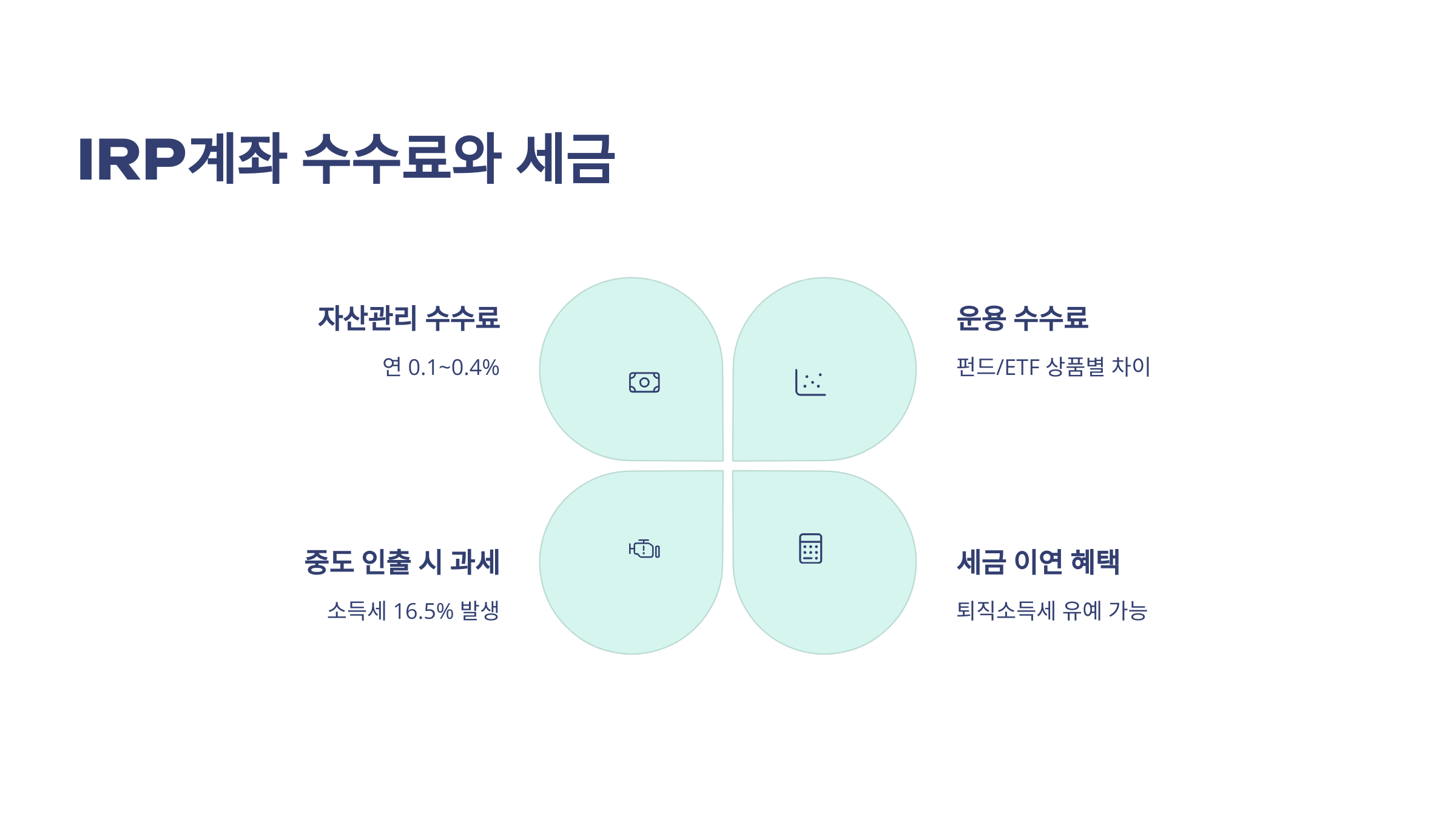 IRP계좌 수수료는 크게 두 가지로 나뉘어요: 1. 자산관리 수수료 2. 운용 수수료 (펀드, ETF 등)
