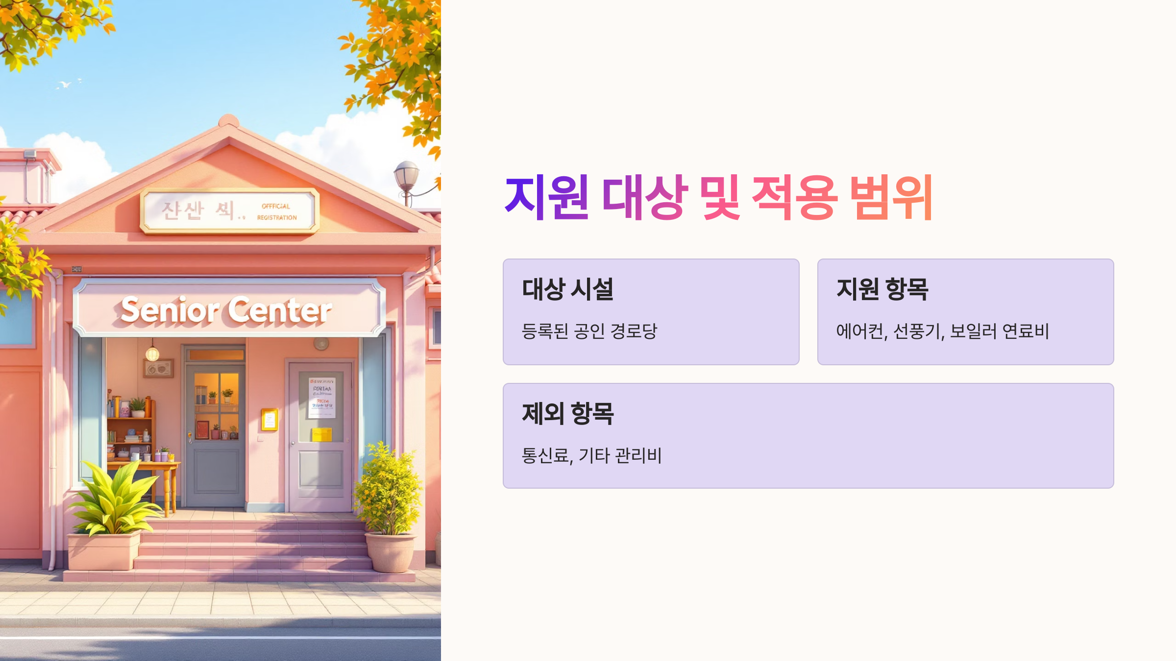 경로당 냉난방비 지원금은 전국의 모든 등록 경로당을 대상으로 운영돼요. 여기서 ‘등록 경로당’이란 지자체 또는 노인복지법에 따라 정식으로 운영되고 있는 공인 시설을 말해요.