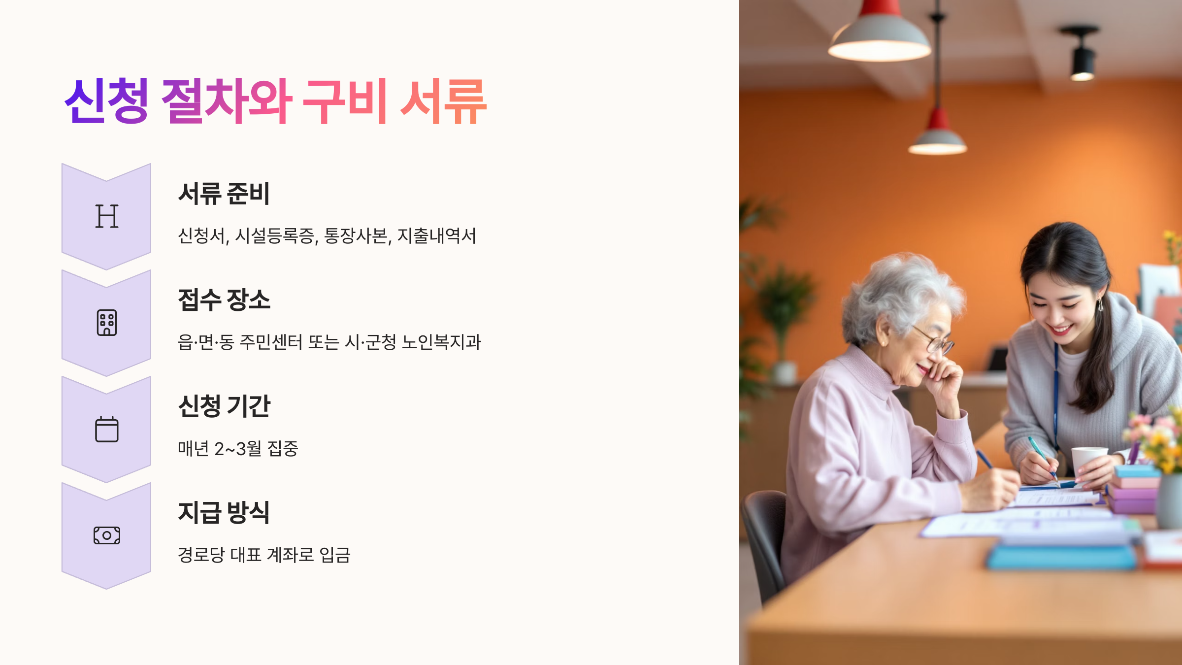 경로당 대표자 또는 운영위원장이 신청서, 시설등록증, 통장 사본, 전년도 지출 내역서 등을 제출해야 해요. 일부 지자체는 온라인 신청을 병행하고 있어요.