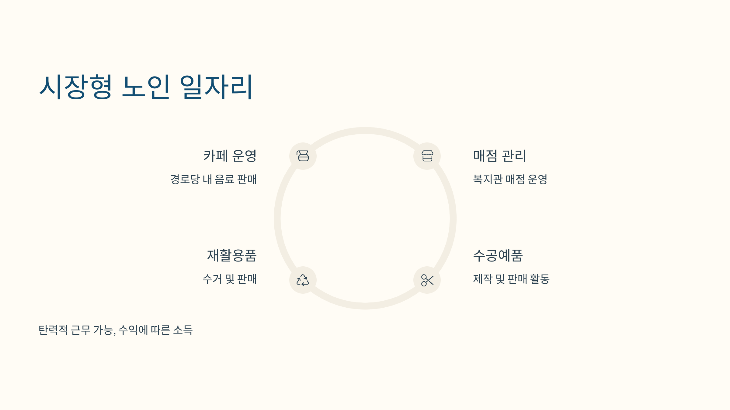 시장형 일자리는 일정한 매출을 통해 수입이 결정되기 때문에 조금 더 자율적이고, 실질적인 ‘일’의 느낌이 강해요. 수익이 큰 경우도 많고, 은퇴 후 창업 형태로 이어지기도 해요.