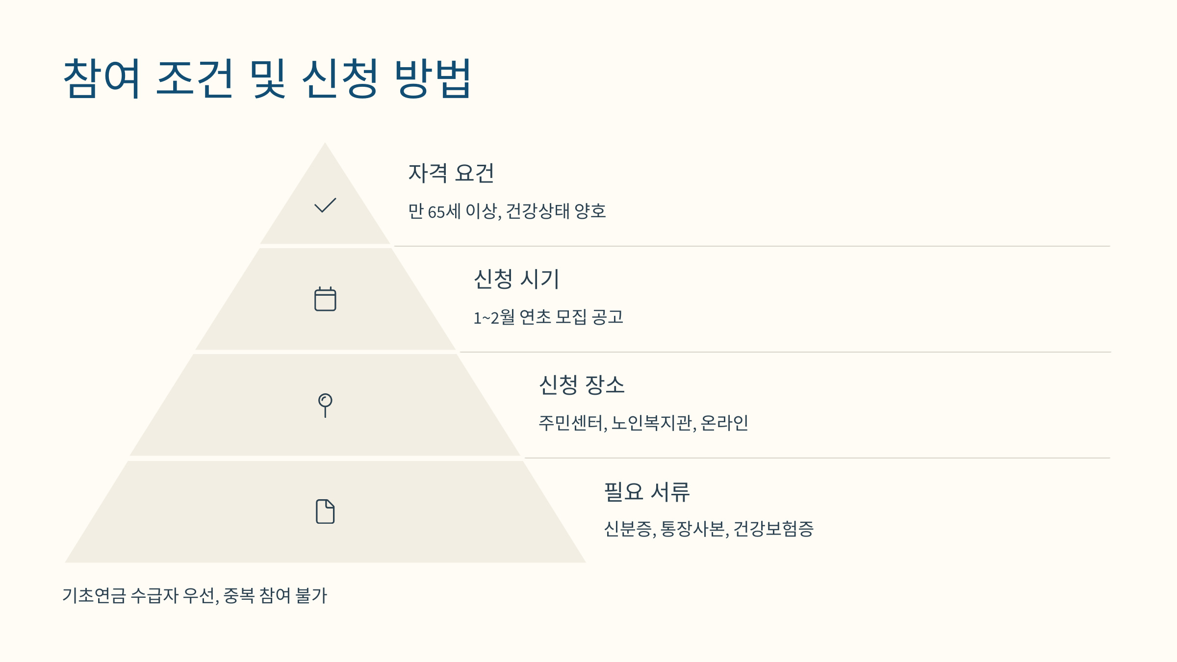 A1. 대부분 참여 가능하지만, 건강상 문제가 없어야 하고 기초연금 수급자가 우선이에요. 일자리마다 세부 기준이 조금씩 달라요.